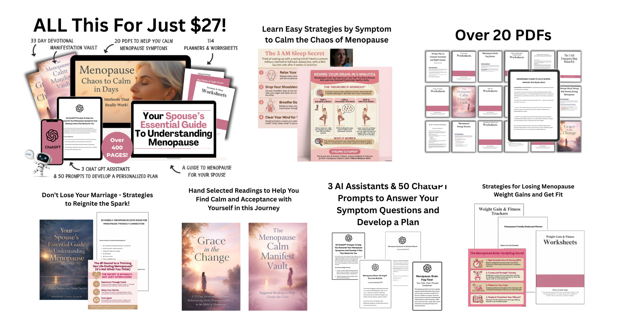 Inside this carefully curated bundle, you’ll find easy-to-follow guides that address hot flashes, night sweats, sleep problems, fatigue, mood swings, brain fog, weight gain, intimacy changes, and joint discomfort — all through proven, holistic methods that work with your body, not against it.